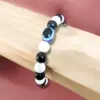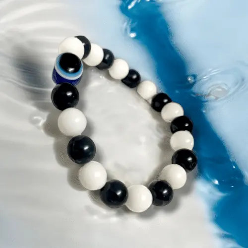 This bracelet is made from a series of beads, alternating between black and white. A blue evil eye charm is incorporated into the design, adding a focal point.