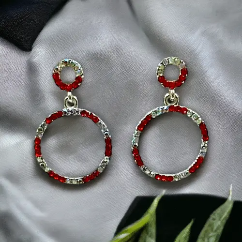 Elevate your everyday style with these stunning double circle stud earrings. The intricate design features two overlapping circles, adorned with sparkling red and clear crystals. The contrasting colors create a captivating visual effect, making these earrings a perfect accessory for any occasion.